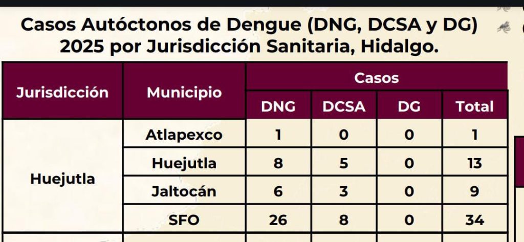 Dijo que, los 57 casos positivos de Dengue se encuentran distribuidos de la siguiente manera: Atlapexco se mantiene con uno, Huejutla de Reyes avanza con 13, Jaltocán con 9 y San Felipe Orizatlán ya lleva 34 casos positivos.