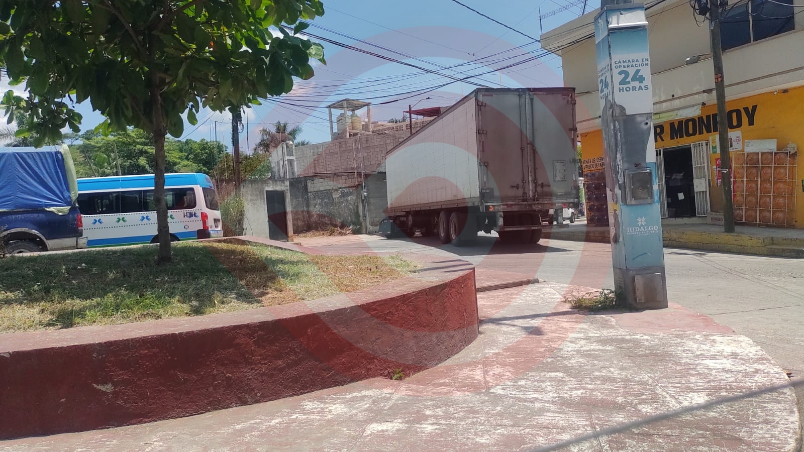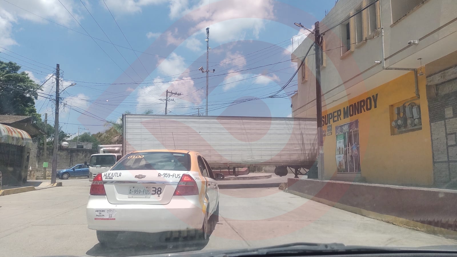 Lo anterior, se pudo observar durante la mañana de este miércoles, cuando un tráiler que circulaba sobre la calle San Luis intentaba dar vuelta hacia la avenida Toribio Reyes, de la colonia Tahuizán, pero debido a que se encuentra una glorieta con pasos muy estrechos, la pesada unidad no lograba librar las banquetas.