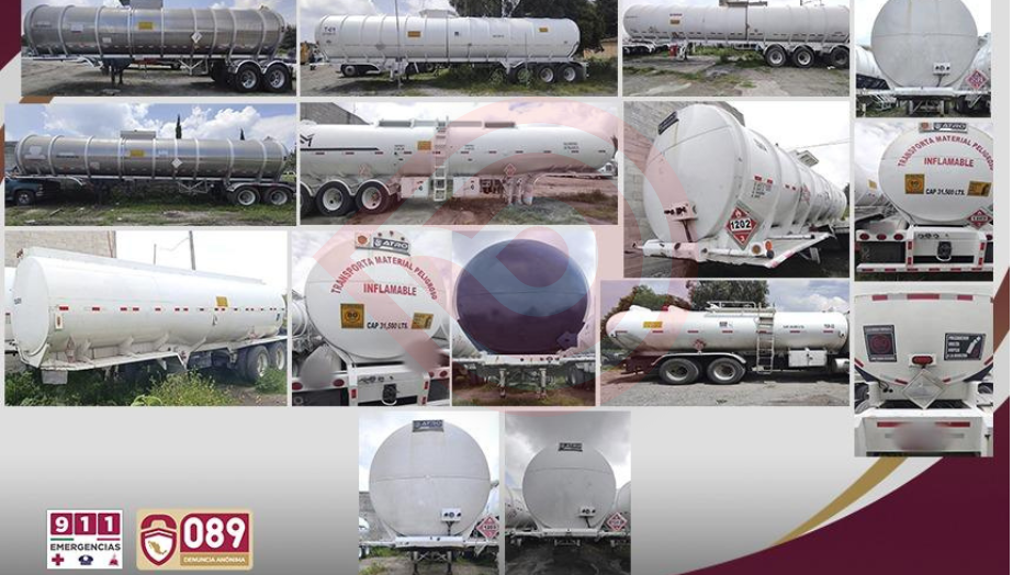 Durante las diligencias, se aseguraron 15 remolques tipo cisterna: seis con capacidad de 31 mil litros, tres con capacidad de 31 mil 500 litros, una pipa de 20 mil litros, dos cisternas con capacidad de 55 mil litros, una con capacidad de 43 mil litros y dos tanques más con capacidad de 33 mil 500 y 35 mil litros; además cuatro de ellos con reporte de robo vigente.