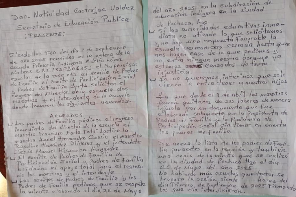 El día lunes, los padres de familia realizaron un documento dirigido al Secretario de Educación, Natividad Castrejón Valdez, en donde le hacen del conocimiento de esta situación.