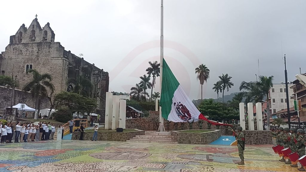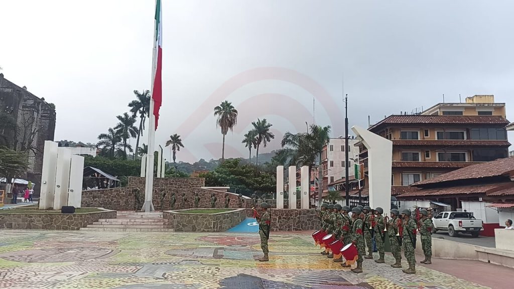 Huejutla, Hidalgo.- Autoridades municipales y militares participaron en el evento cívico de los Honores e izamiento de bandera en la explanada del reloj municipal en Huejutla de Reyes con motivo del 215 aniversario del Grito de Independencia.