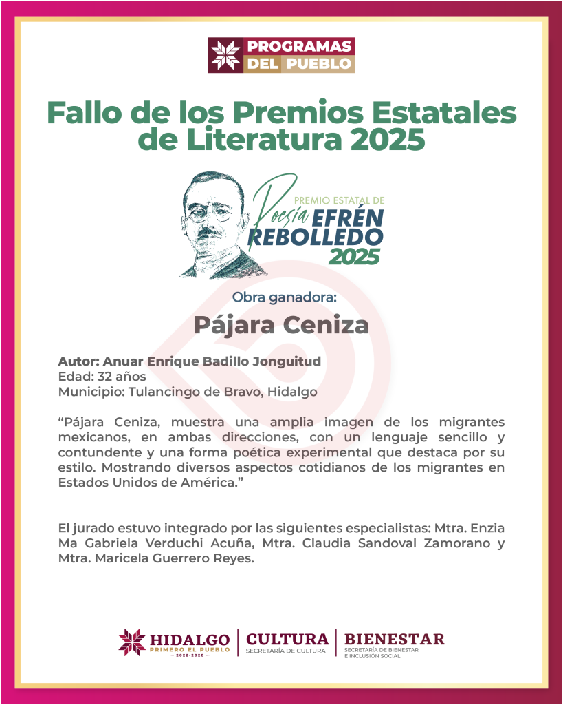 En poesía, el premio fue para Anuar Enrique Badillo Jonguitud, de Tulancingo, con el poemario “Pájara Ceniza”. La obra fue reconocida por su manera de abordar el tema migratorio con un lenguaje sencillo y contundente, además de su propuesta poética experimental que aporta frescura y fuerza a la tradición literaria del estado.