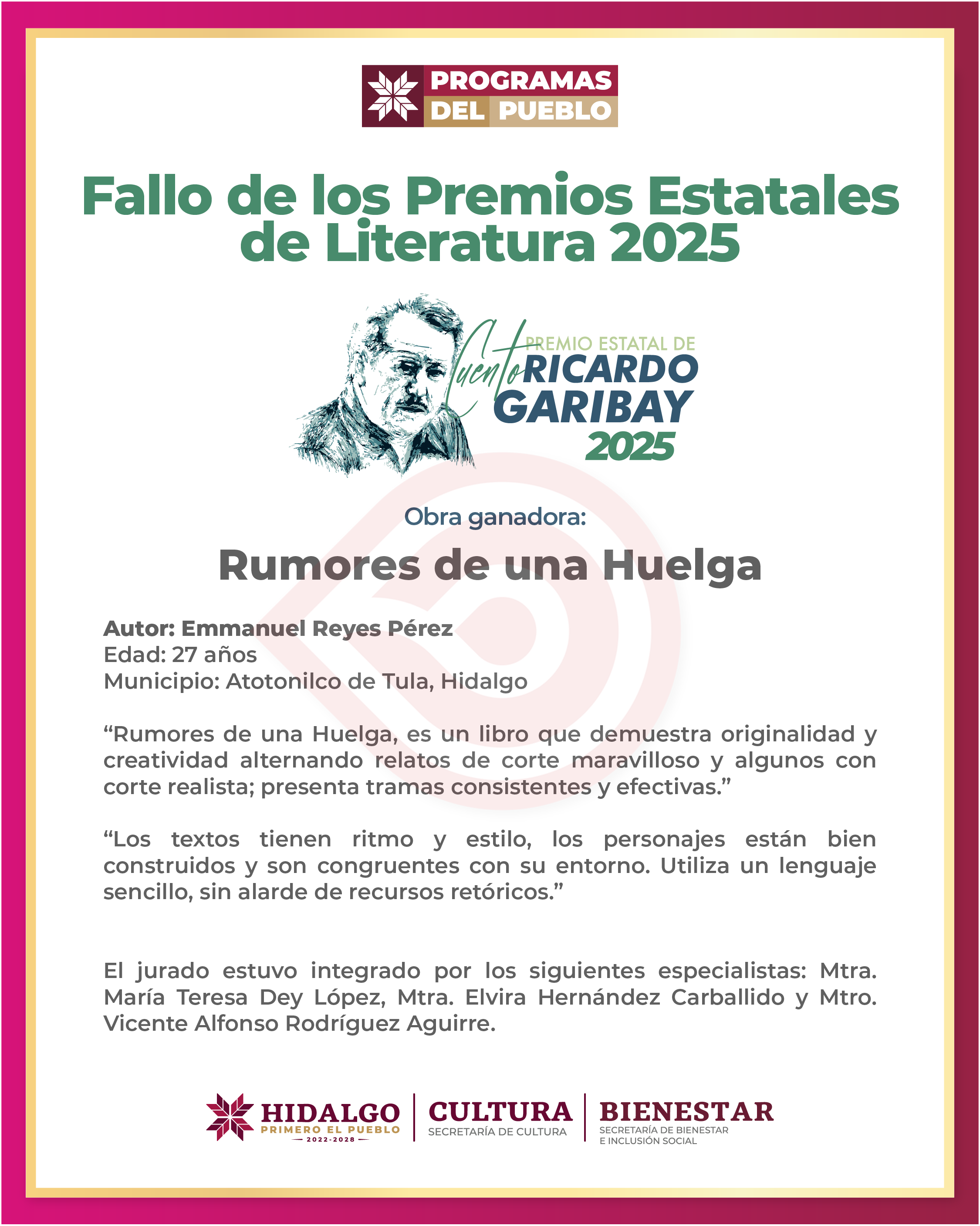 Reyes Pérez, de 27 años, ha sido reconocido previamente en concursos estatales y nacionales, consolidándose como una de las voces emergentes de la literatura hidalguense.