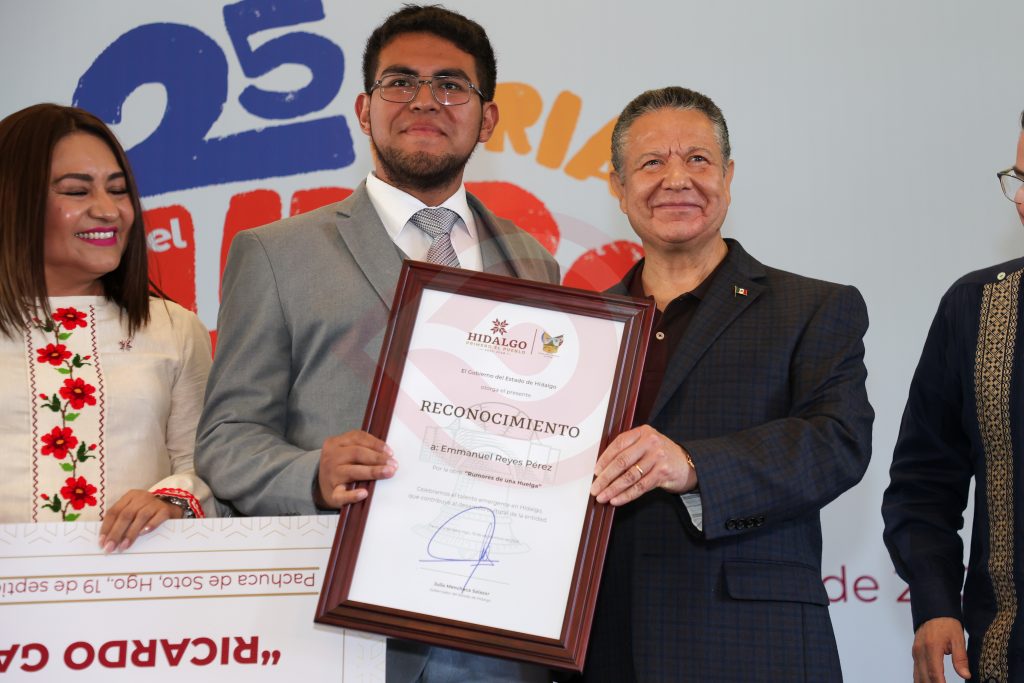 Como parte del evento, Menchaca Salazar hizo entrega del Premio Estatal de Poesía “Efrén Rebolledo” a Anuar Enrique Badillo Jonguitud, y del Premio de Cuento “Ricardo Garibay”, a Emmanuel Reyes Pérez. Ambos galardonados agradecieron el apoyo brindado para la realización de sus obras “Pájara Ceniza” y “Rumores de una Huelga”, respectivamente.