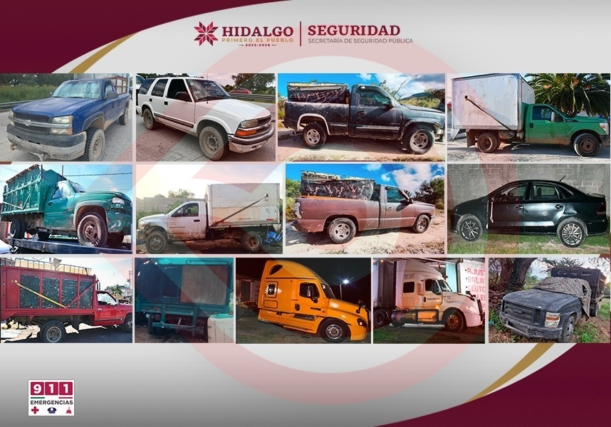 En los municipios de Tula de Allende y Tepetitlán se recuperaron 10 camionetas, de las cuales seis cuentan con reporte de robo, mil 200 litros de hidrocarburo de procedencia ilícita, 30 contenedores de capacidades de mil y 50 litros, 10 metros de manguera de alta presión y una motobomba de agua.
