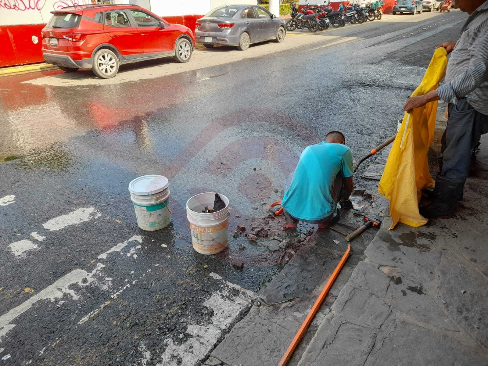 Explicaron que la fuga fue localizada en la manguera de una toma domiciliaria en la Avenida Hidalgo, que da servicio a un comercio farmacéutico, y fue necesario romper un poco el pavimento para su reparación.