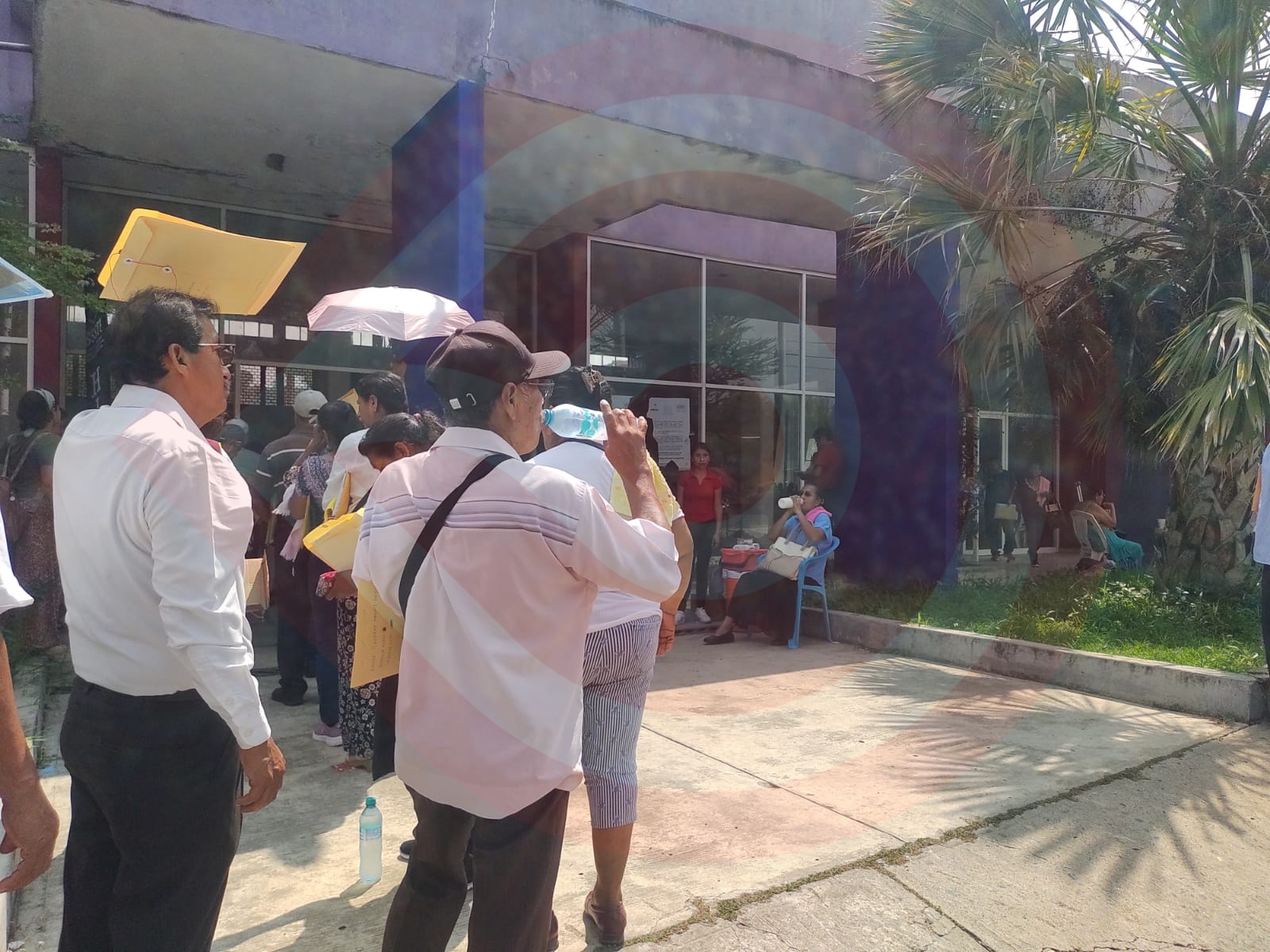La fila alcanzó todo lo largo de las canchas deportivas sobre la banqueta y dio vuelta en la esquina, abarcando otra cuadra más y conforme avanzó la mañana el sol fue poniéndose hasta llegar a un punto en el que no había donde resguardarse de sus rayos, por lo que los adultos tenían que permanecer de pie y hacia las 12:00 del mediodía todavía continuaban formados.