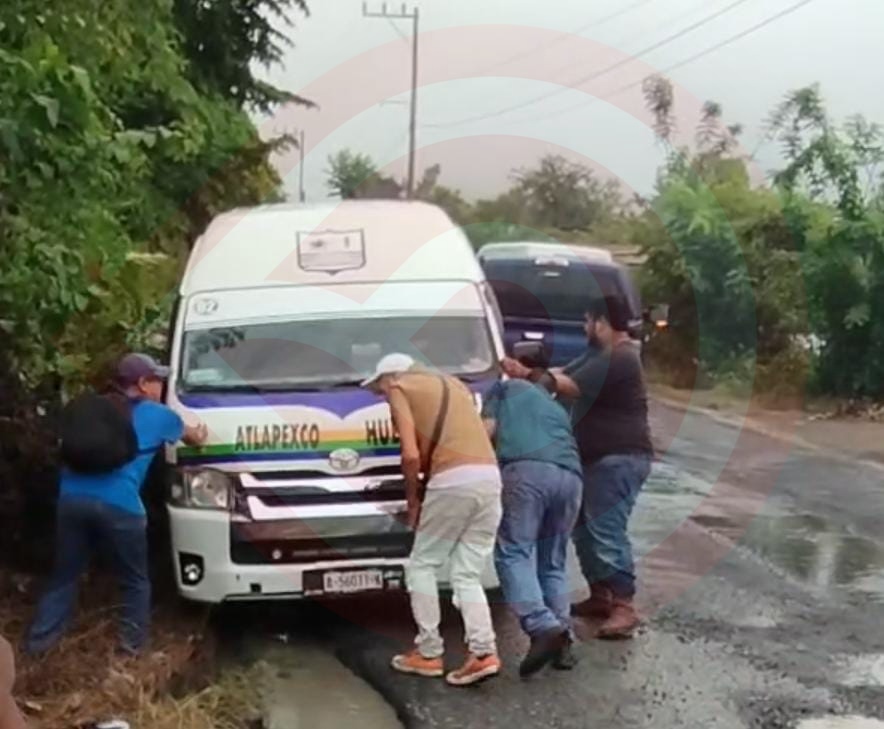 Huejutla, Hgo.- Derivado de las lluvias que se estan presentando en la región, la mañana de este jueves 9 de octubre, a la altura de la localidad de Candelaria, sobre la vía Álamo – Tamazunchale, una combi pasajera de la ruta Atlapexco – Huejutla perdió el control, quedando en una cuneta.