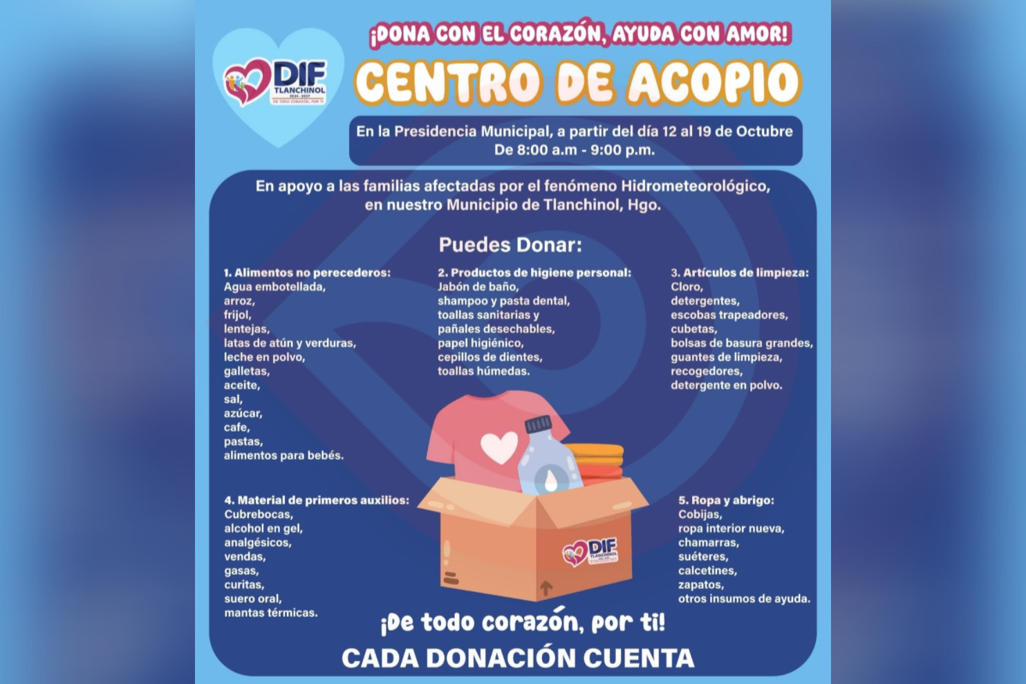 Con el lema “Dona con el corazón, ayuda con amor. De todo corazón por ti”, el DIF Municipal hace un llamado a la población para unirse a esta noble causa, entregando víveres, artículos de higiene personal, ropa en buen estado y demás productos de primera necesidad, que serán canalizados a las comunidades más afectadas.