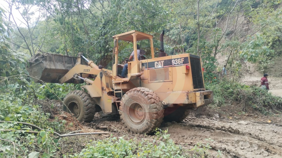 Tlanchinol:Retiro de más de 800 metros cúbicos (m³) de derrumbes en la carretera estatal Acatempa – San Salvador – Toctitlán en el kilómetro 1 + 500 con apoyo de un cargador frontal.