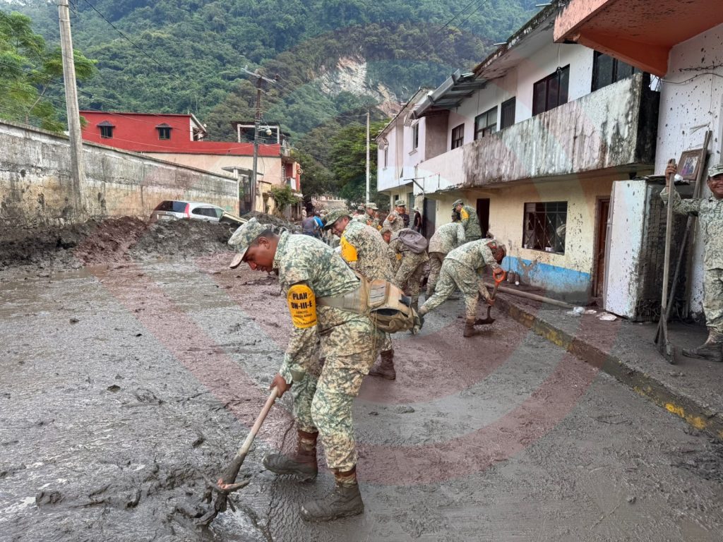 La CFE trasladó vía aérea postes desde Tlaxco, Puebla, para reinstalar el servicio eléctrico. La Secretaría de Seguridad Pública trabaja en la apertura de caminos en 22 comunidades, con apoyo de 50 carretillas y más de 170 elementos federales.