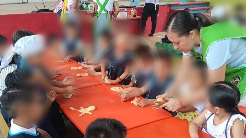 Con entusiasmo y creatividad, los pequeños participaron en la elaboración del pan, guiados por sus maestras, dando forma a los tradicionales muñecos que son parte esencial de la ofrenda del Día de Muertos en la región.