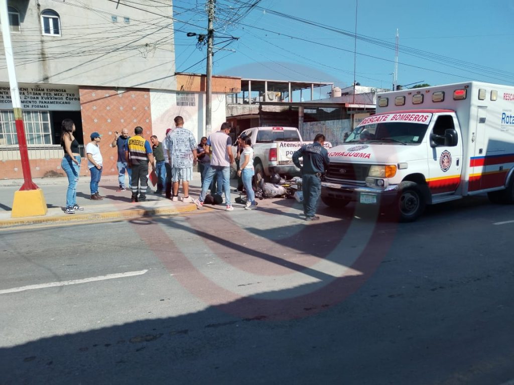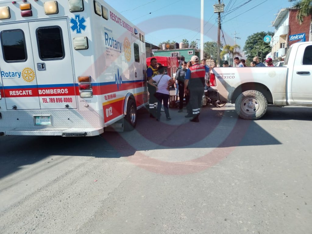 El accidente ocurrió la mañana de este sábado, cuando el motociclista al manejar a exceso de velocidad y no alcanzar a frenar, chocó con una camioneta Dodge de Bienestar; paramédicos de inmediato llegaron para brindar los primeros auxilios a los lesionados solo en el lugar de los hechos.