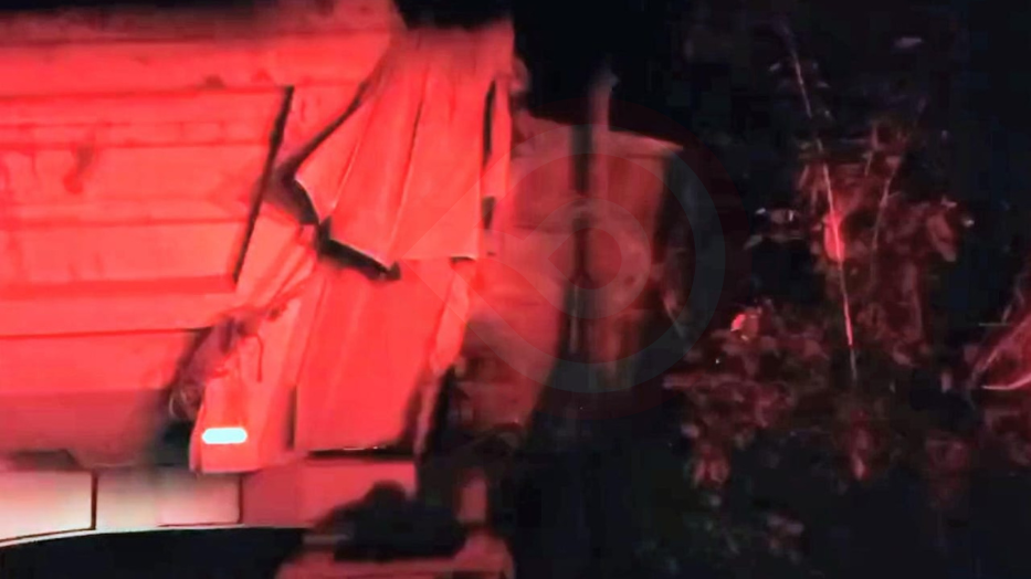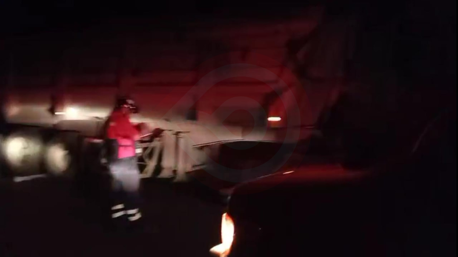 El accidente ocurrió a unos metros de la capilla de la Santa muerte, donde la pesada unidad terminó con la cabina en el monte.