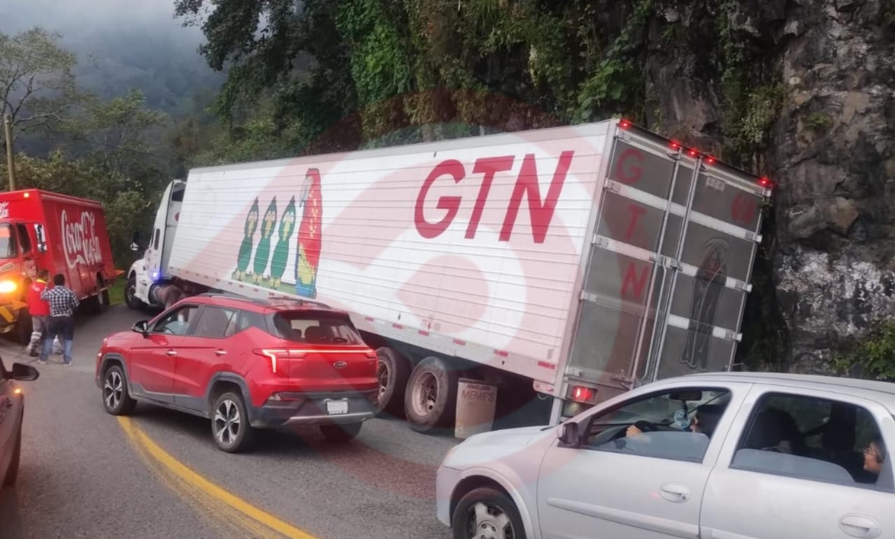 El accidente ocurrió a la altura de casetas cuando el conductor de la pesada unidad perdió el control del coloso y terminó con la caja fuera de la cinta asfáltica y mientras que su cabina terminó atravesada en la carretera.