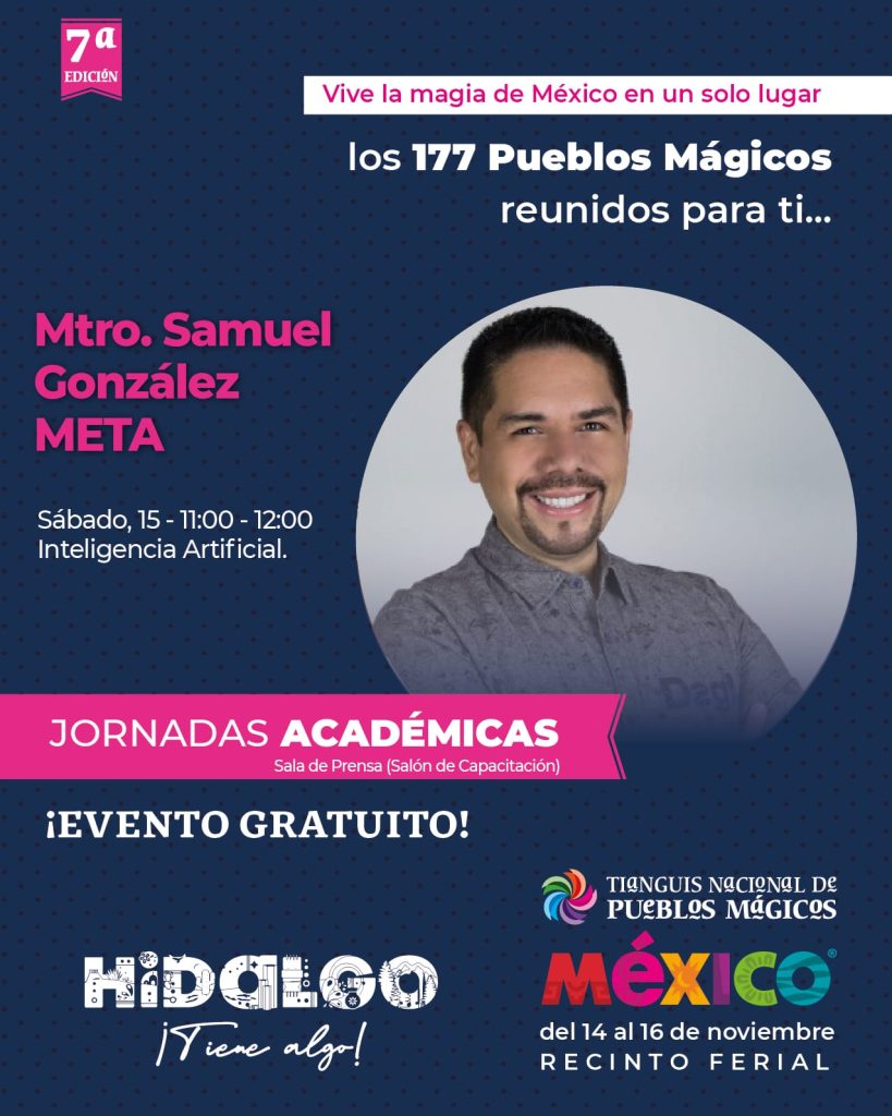 Durante el segundo día de actividades, el 15 de noviembre, se desarrollará la conferencia “Inteligencia Artificial: potencializando el marketing de pymes y emprendedores”, impartida por Samuel González, miembro de la red de facilitadores de META, quien ofrecerá herramientas para optimizar la presencia digital y la generación de contenido.