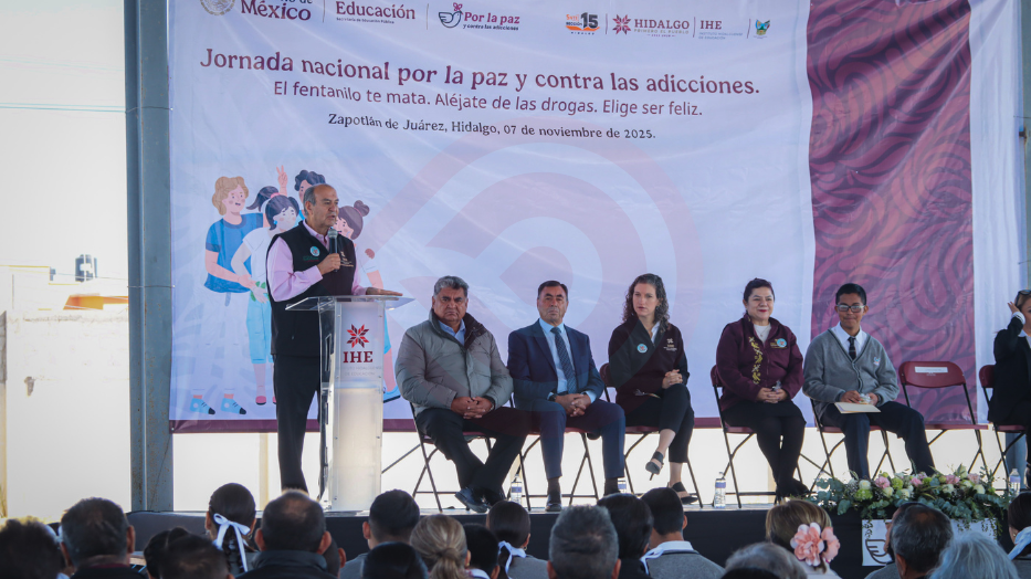 Pachuca de Soto, Hgo.- El secretario de Educación Pública de Hidalgo, Natividad Castrejón Valdez, encabezó en Zapotlán de Juárez la Jornada Nacional por la Paz y Contra las Adicciones: “El fentanilo te mata. Aléjate de las drogas. Elige ser feliz”, cuyas actividades se realizaron en la Escuela Secundaria General “Juan Guillermo Villasana López”.