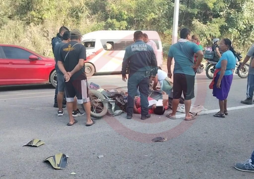 El percance que ocurrió entre una motociclista Italika y una camioneta Chevrolet, color blanco, Silverado de una bloquera de Huejutla, ante el impactó los motoristas quedaron tirados a media carretera y con lesiones considerables.
