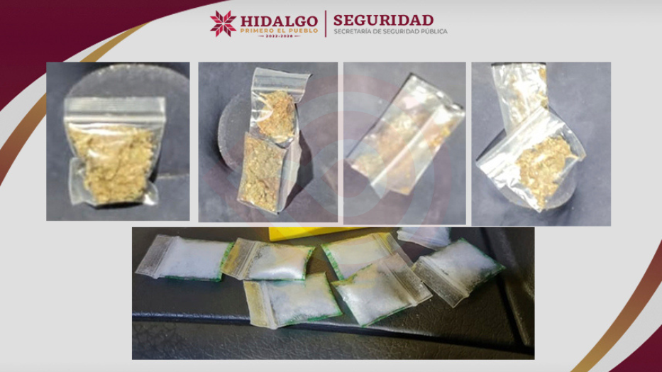 Durante la intervención, las autoridades localizaron 183 dosis de hierba verde seca con características propias de la marihuana, así como 23 dosis de sustancia granulada similar al “cristal”, las cuales eran presuntamente destinadas a la venta y consumo.