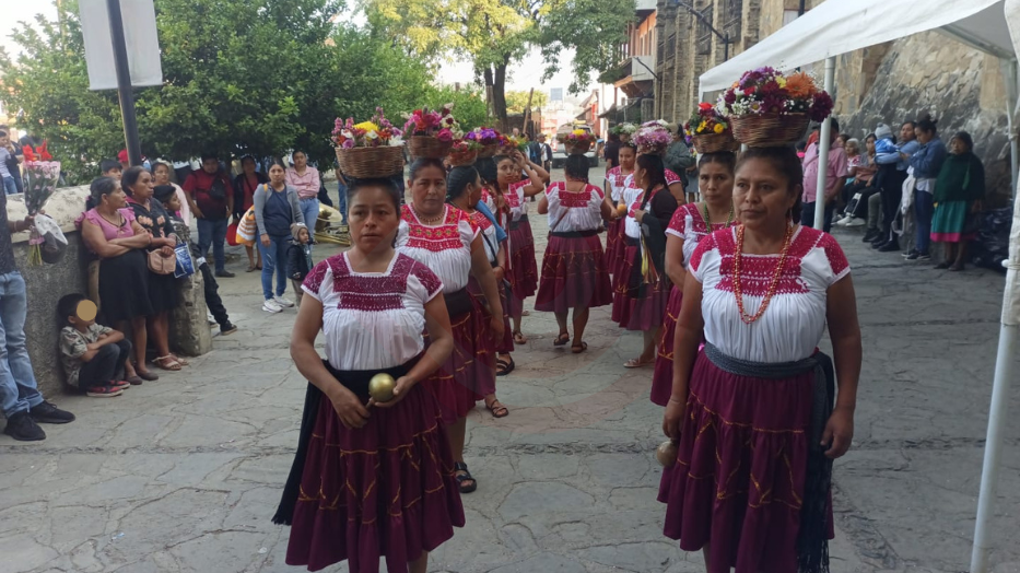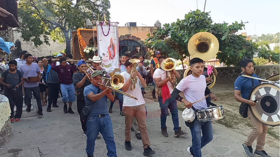 En el recorrido de los fieles católicos con el Padre Jesús fueron acompañados por el grupo de danzantes de las Inditas y la auténtica Banda Cielo Azul de San Francisco Huazalingo.