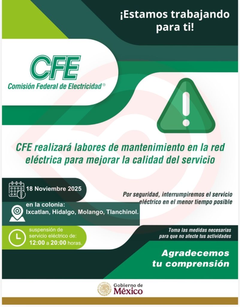 La suspensión abarcará desde la localidad de Ixcatlán Huejutla de Reyes, Molango y Tlanchinol, experimentarán la interrupción temporal del suministro, lo que podría impactar actividades cotidianas, comercios y servicios que dependen de la electricidad.