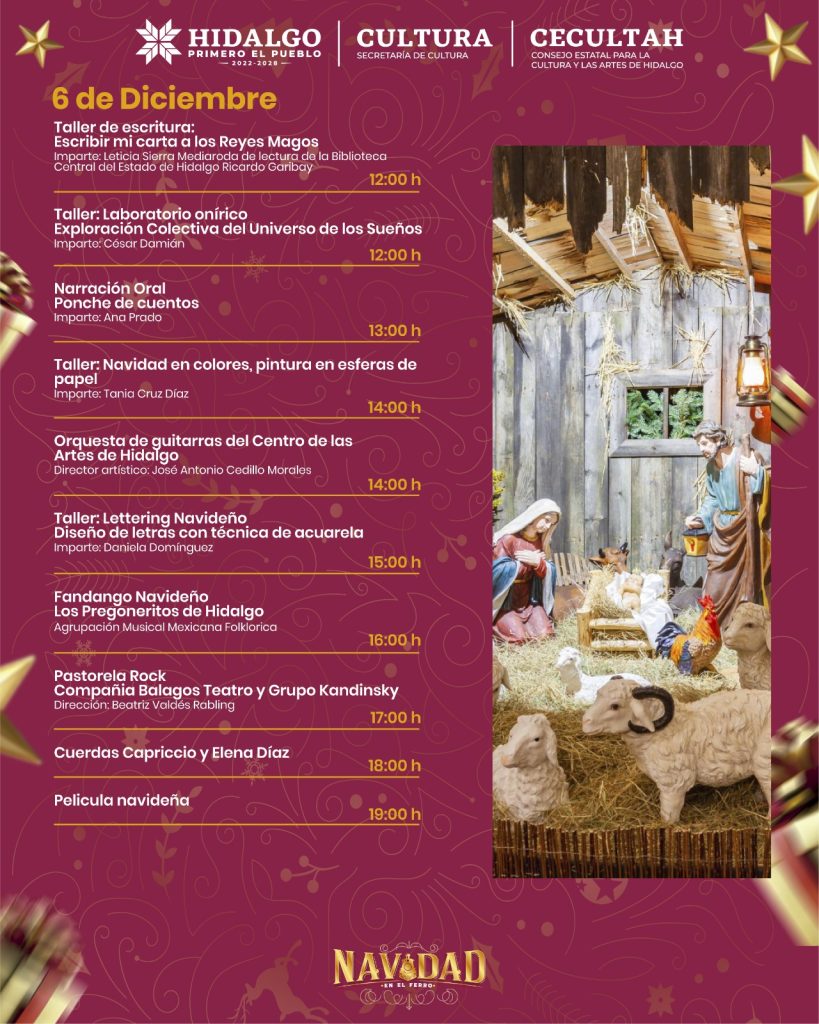 El sábado 6 de diciembre continuarán las actividades con talleres creativos como “Escribir mi carta a los Reyes Magos”, pintura de esferas, lettering navideño y narración oral. Ese día destaca la participación de agrupaciones artísticas con propuestas como el Fandango Navideño de Los Pregoneritos de Hidalgo, la pastorela rock de Balagos Teatro y Grupo Kandinsky, así como la presentación de Cuerdas Capriccio y Elena Díaz. La jornada cerrará con una película navideña.