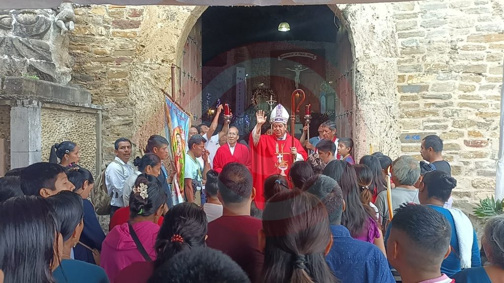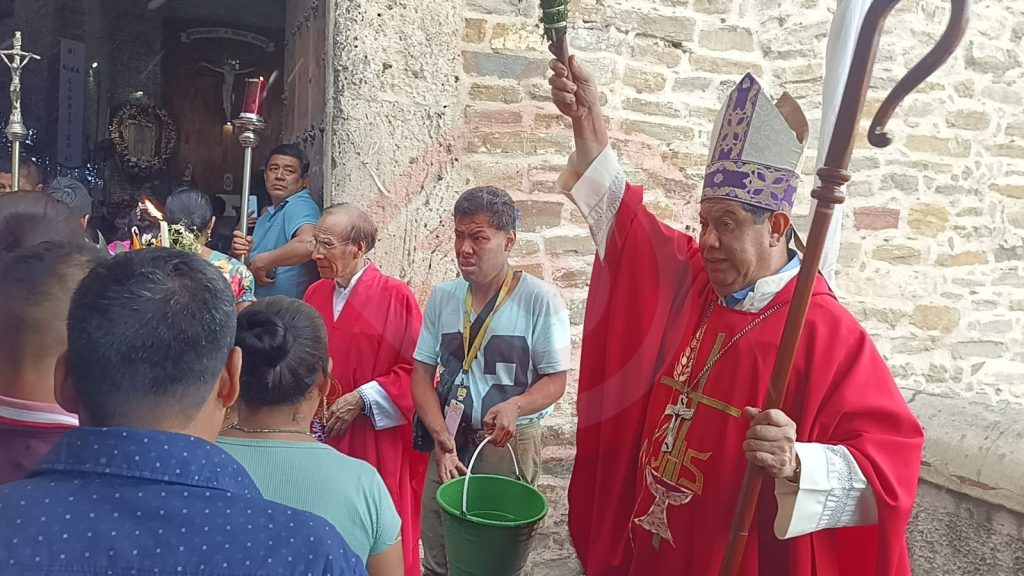 La recepción de los cientos de fieles católicos en el acceso principal a la parroquia del Sagrario Catedral estuvo a cargo del Obispo de la Diócesis de Huejutla, José Hirais Acosta Beltrán.