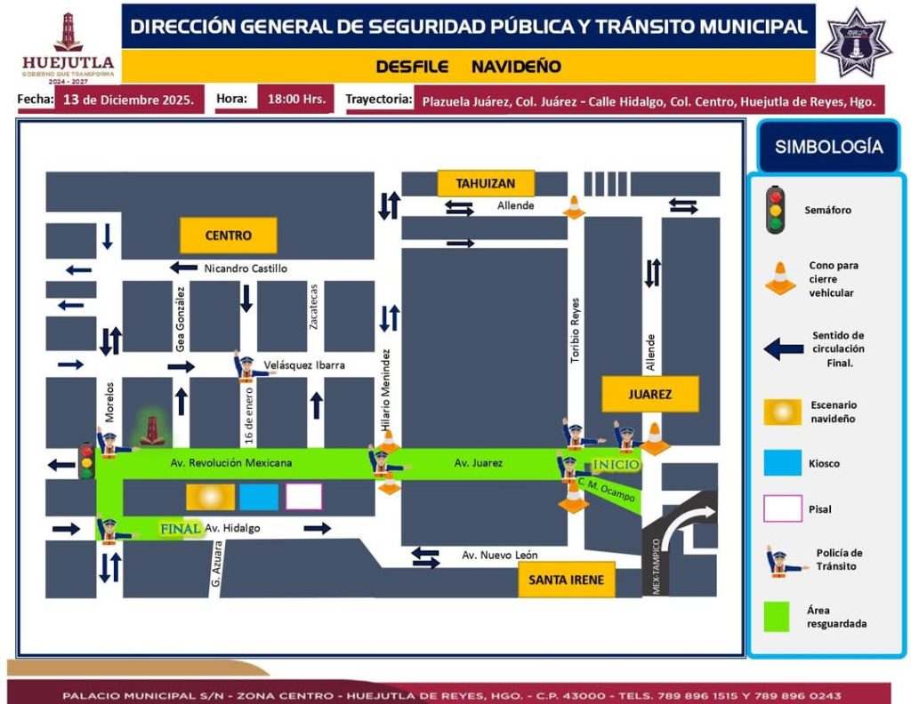Huejutla de Reyes, Hgo.– Con motivo del desfile navideño programado para este sábado 13 de diciembre, a las 18:30 horas, autoridades municipales informaron que se realizarán cierres temporales a la circulación vehicular en diversas vialidades de la ciudad.