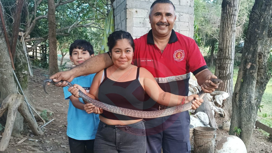 Huejutla, Hgo.- El Heroico Cuerpo de Bomberos de Huejutla respondió a un llamado de emergencia en la localidad de Los Laureles, Chiconamel, Ver., donde una culebra de aproximadamente 1.40m se había introducido al patio de una casa.