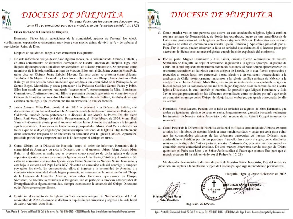 El comunicado es dirigido a los fieles laicos, autoridades de la comunidad, agentes de Pastoral, a quienes destaca: He sido informado que ya desde hace algunos meses, en la comunidad de Atempa, Calnali, y en otras comunidades de diferentes Parroquias de nuestra Diócesis de Huejutla, han llegado algunas personas que dicen ser sacerdotes, un diácono y un obispo, se presentan como miembros de la iglesia católica antigua de México, ellos son: el Jaime Antonio Mota Ruiz quien dice ser Obispo, Jorge Zabdiel Moreno Carrasco quien se presenta como diácono, Miguel Hernández y Luis Javier.