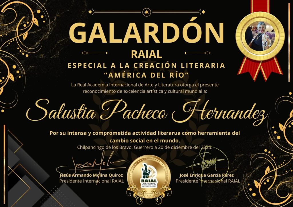 Huejutla de Reyes, Hgo.- La Real Academia Internacional del Arte y la Literatura otorgó un galardón a la maestra Salustia Pacheco Hernández, en reconocimiento a su compromiso y destacada labor dentro del ámbito literario.