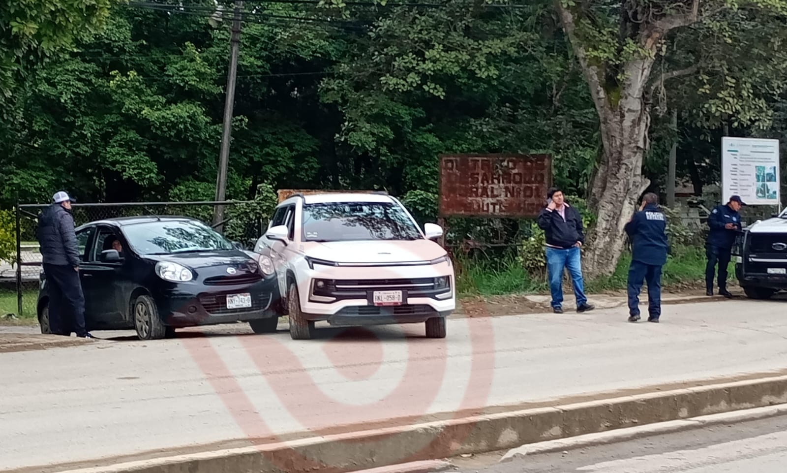 Se trata de un automóvil Nissan March y una camioneta Kia, ambas unidades salían de esa dependencia federal y al no cederse el paso chocaron, sólo hubo daños materiales y sin víctimas humanas que lamentar; ambos conductores no llegaban a un acuerdo para pago de los daños y se mantuvieron por largo periodo en ese lugar.