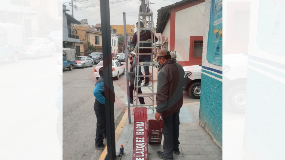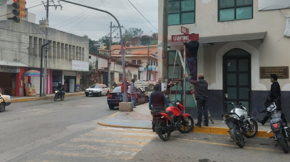 De igual manera, se procedió a la colocación de nomenclatura frente a las ex oficinas del Juzgado Civil y Familiar, en la calle Cuauhtémoc, esquina con Morelos, reforzando la identificación de vialidades en este punto de la ciudad.