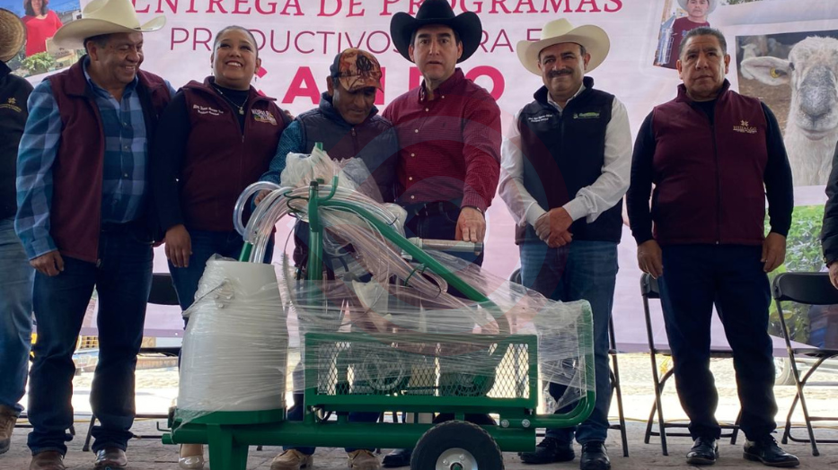 De igual manera, se entregaron semillas de avena, maíz y jitomate, desbrozadoras, ordeñadoras, bombas aspersoras, rollos de alambre y módulos de sombra, así como plántulas e hijuelos de maguey, insumos y herramientas contribuirán tanto al fortalecimiento de las unidades productivas como al bienestar de las familias beneficiarias.