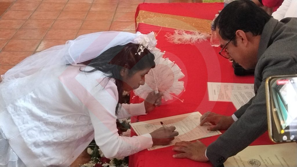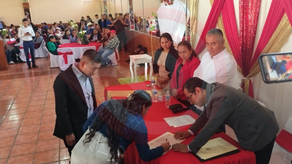 Posteriormente, pasaron de manera simbólica tres parejas a firmar el acta de matrimonio ante el Juez de lo Familiar y fueron declarados marido y mujer ante la ley, por lo que se dieron el tradicional beso y se dio paso al banquete, mientras, el resto de las parejas eran llamadas junto con sus testigos para pasar a firmar.