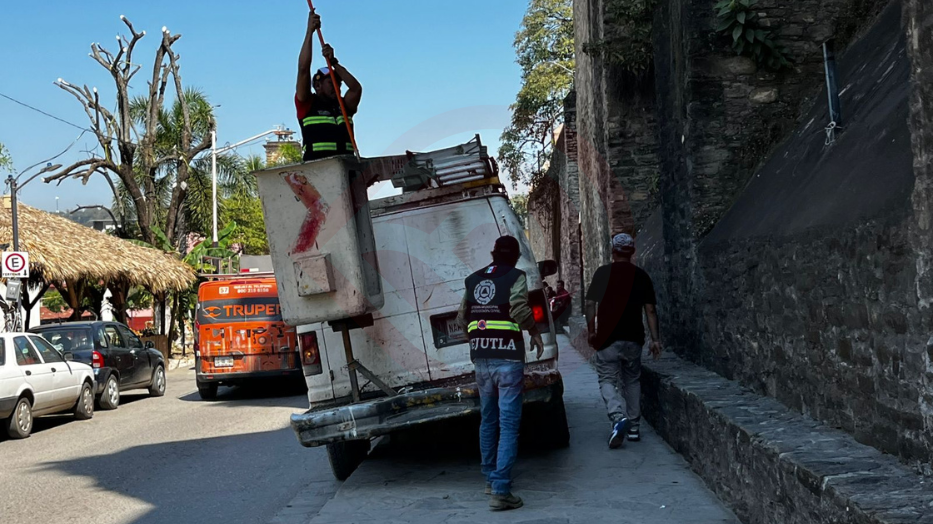 Para facilitar las labores, Protección Civil cuenta con el respaldo de una grúa proporcionada por el área de Alumbrado Público, lo que permite avanzar en las zonas más altas.