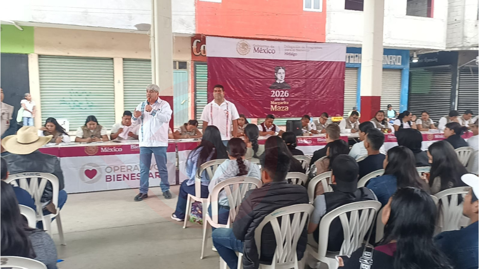 Huejutla, Hgo.- El delegado federal de Programas sociales para el Bienestar en Hidalgo, Abraham Mendoza Zenteno, y el director regional de Bienestar en la Sierra y Huasteca, Gelacio Velázquez Hernández, encabezaron la entrega de tarjetas a beneficiarios del programa Jóvenes construyendo el futuro en esta ciudad de Huejutla.