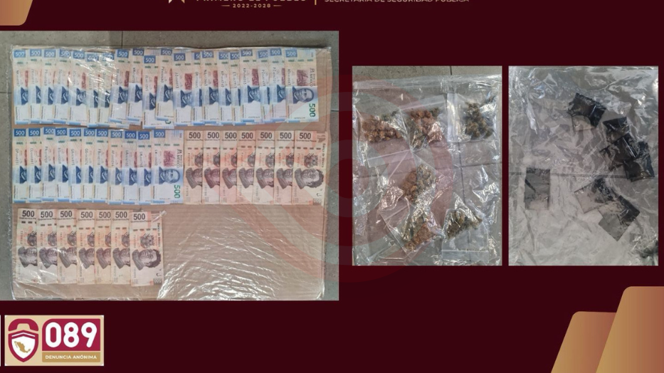 En el vehículo se localizaron diversas dosis de distinta droga, 22 mil 500 pesos en efectivo y un equipo de telefonía celular, aparato que podría estar relacionado con la coordinación de estas actividades ilícitas.