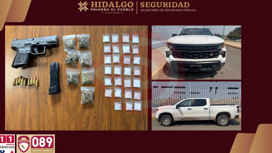 Acayutlán, Hgo.- Tras el reporte por detonaciones de arma de fuego en el municipio de Tezontepec de Aldama, elementos de la Secretaría de Seguridad Pública de Hidalgo (SSPH) lograron la detención de dos hombres, además del aseguramiento de un arma corta con cartuchos útiles, diversas dosis de narcóticos y una camioneta con alteración en sus medios de identificación.