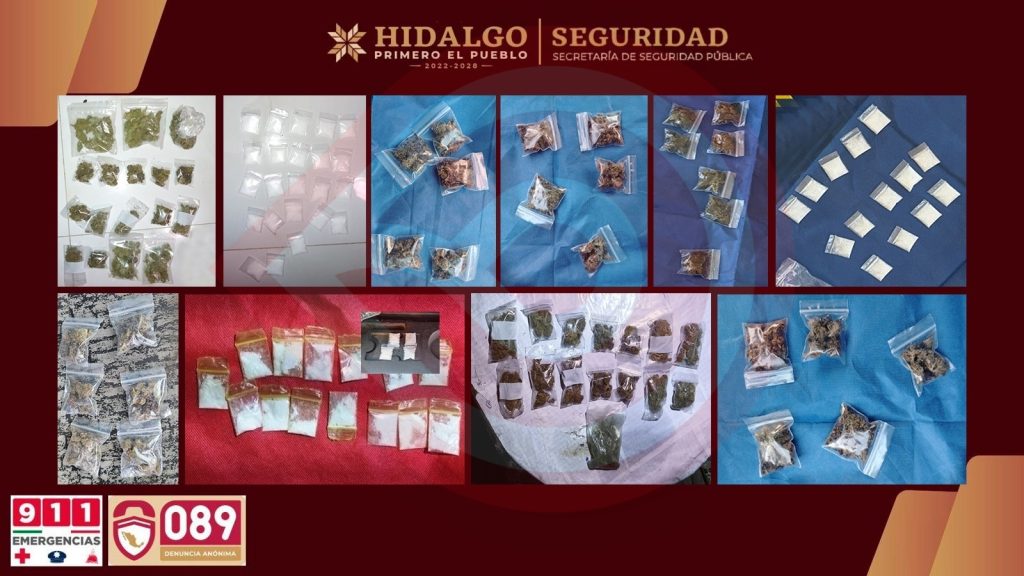 Además, se aseguraron 725 dosis de distintas sustancias con características de marihuana y presunto cristal, las cuales se encontraban listas para su distribución.