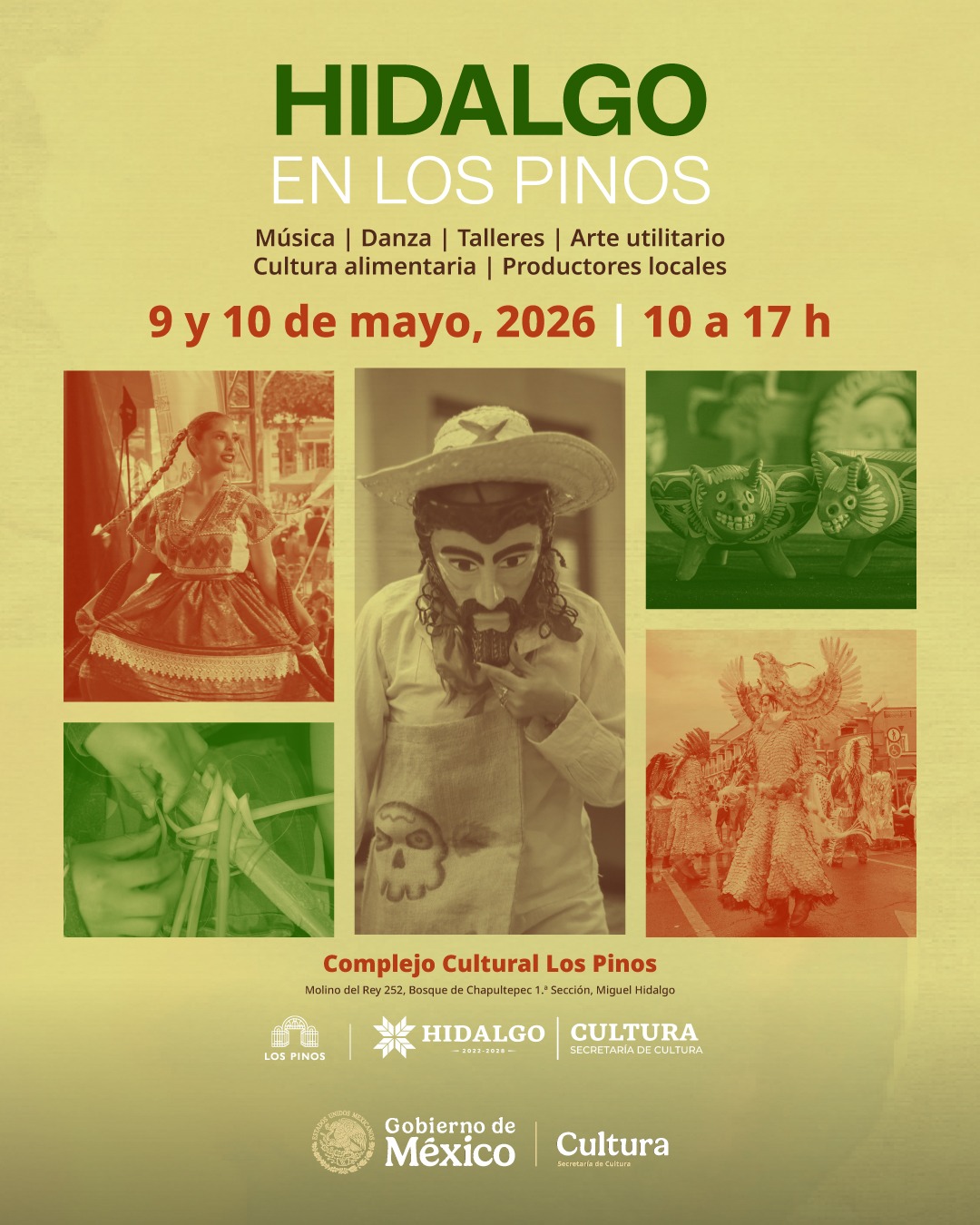 Ciudad de México. – La Secretaría de Cultura del Gobierno de México y el Gobierno del Estado de Hidalgo, a través de su Secretaría de Cultura, organizan el festival “Hidalgo en Los Pinos”, que lleva al Complejo Cultural Los Pinos más de 900 artistas, personas artesanas, cocineras tradicionales, talleristas, juegos tradicionales, productores locales y elencos de la entidad los días 9 y 10 de mayo de 10 a 17 h.