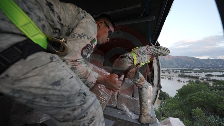 Pachuca de Soto, Hgo.- Elementos del Ejército Mexicano hacen llegar ayuda humanitaria por aire a las comunidades que aún se encuentran incomunicadas vía terrestre, comunidades sin una planicie dónde puedan aterrizar los helicópteros.
