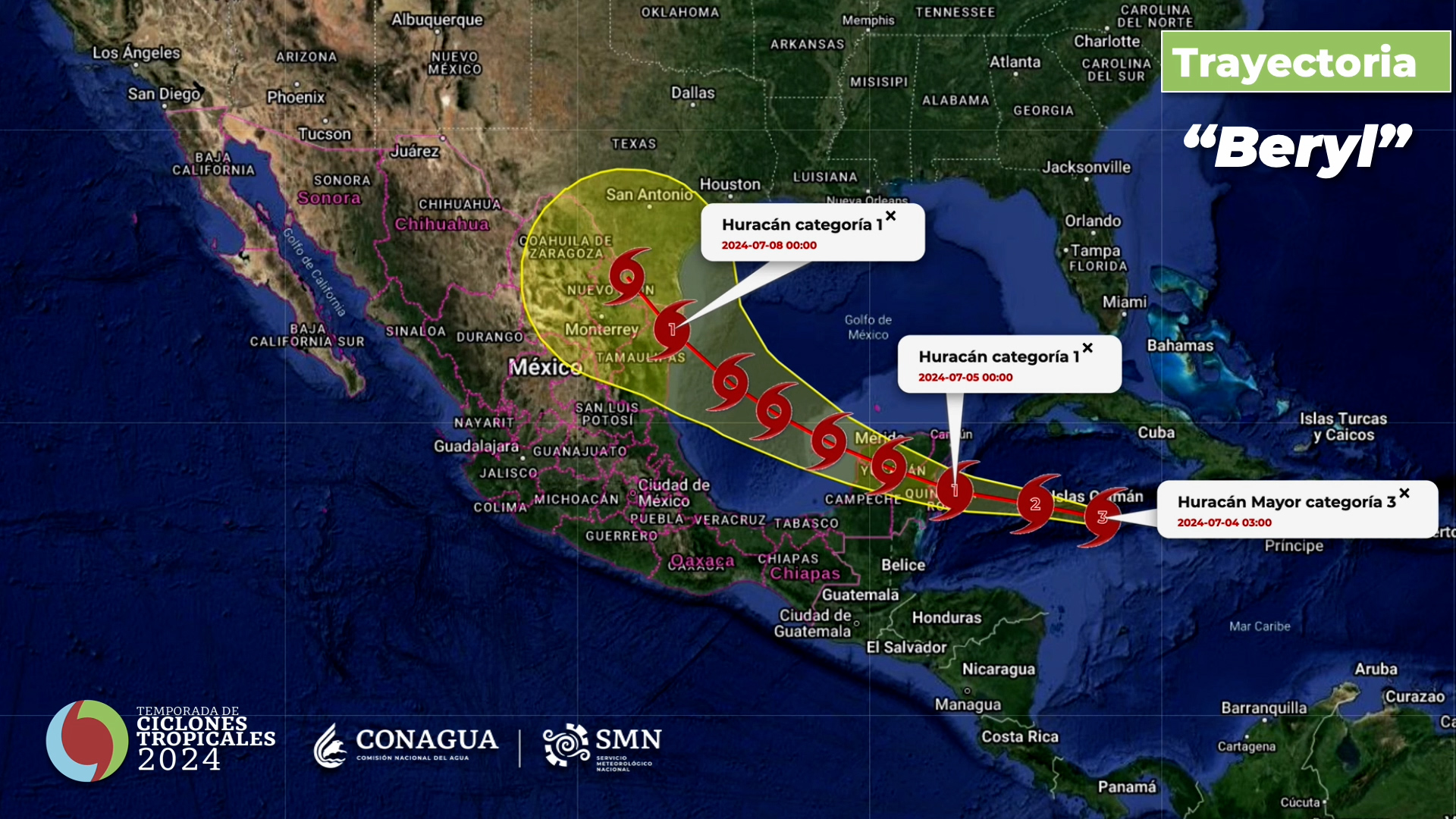 Beryl mantiene desplazamiento hacia la Península de Yucatán, como huracán categoría dos