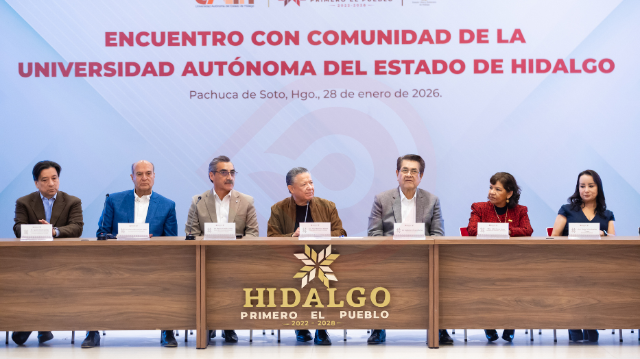 Pachuca de Soto, Hgo.- El gobernador de Hidalgo, Julio Menchaca Salazar, se reunió con integrantes de la comunidad de la Universidad Autónoma del Estado de Hidalgo (UAEH), a la cual reconoció por su labor académica, y llamó a redoblar esfuerzos para consolidar a la entidad como un polo de desarrollo con sólido capital humano.