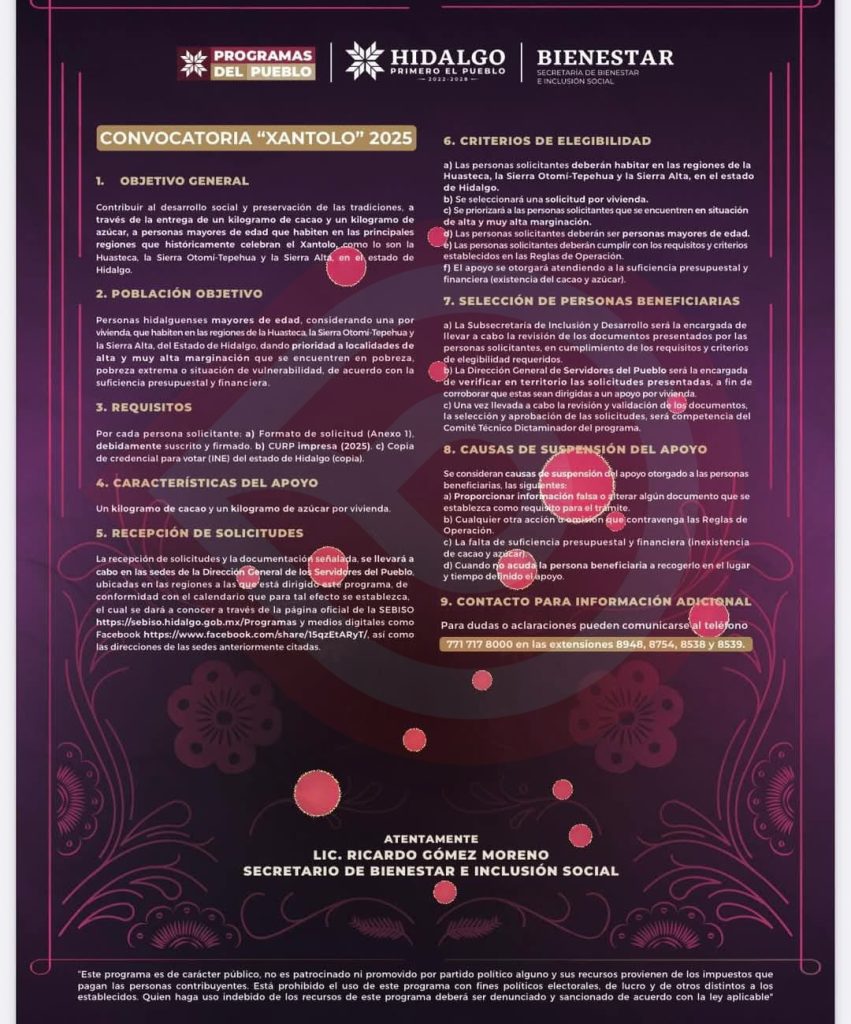 Huejutla de Reyes, Hgo.- La Secretaría del Bienestar e Inclusión Social del Estado de Hidalgo (SEBISO) emitió una convocatoria dirigida a la población interesada en participar en el programa Xantolo 2025, el cual contempla la entrega de un kilo de cacao y de azúcar como apoyo para la celebración tradicional, sin embargo, esto ha generado diversas reacciones entre la población, ya que no se garantiza la entrega de dicho apoyo.