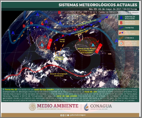 Condiciones para la formación de torbellinos, se prevén en Chihuahua, Nuevo León y Tamaulipas, así como tornados en Coahuila. Se pronostican temperaturas máximas de 40 a 45 grados Celsius en zonas de Campeche, y de 35 a 40 grados Celsius en otros 21 estados del país. Hoy, se pronostican lluvias puntuales muy fuertes (de 50… Seguir leyendo Se pronostican lluvias muy fuertes en Chiapas, y fuertes en regiones de Coahuila, Guerrero, Oaxaca y Puebla