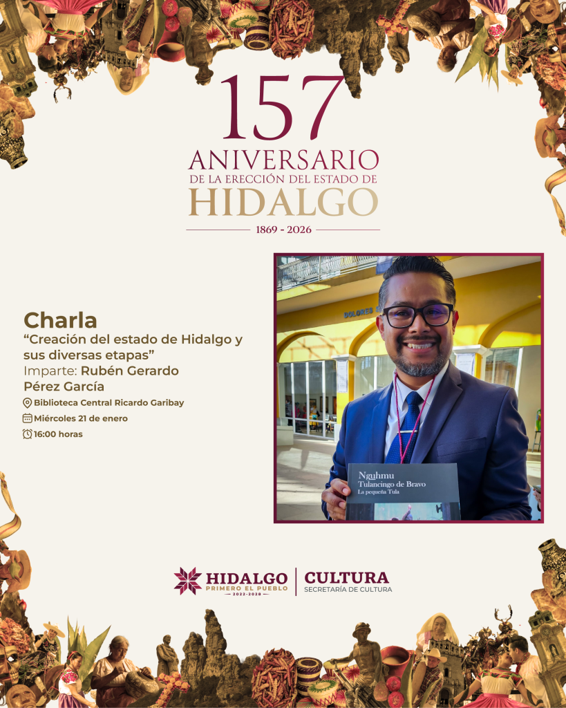 Para cerrar la jornada, el 21 de enero a las 16:00 horas, en la Biblioteca Central Ricardo Garibay, Rubén Gerardo Pérez García impartirá la charla Hidalgo y sus diversas etapas, una reflexión histórica que permitirá al público profundizar en los procesos que dieron origen y forma al estado a lo largo del tiempo.