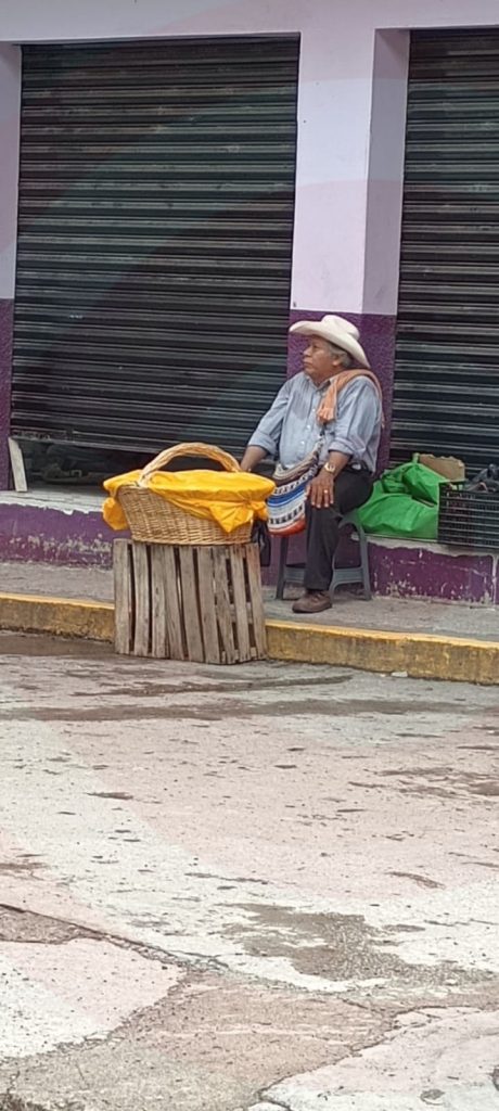 Se trata de Don Jorge Peña, originario de Tamán, Pozo Encantado, quien todos los días acude a la zona centro del pueblo con un enorme canasto copeteado de chilindrinas, granadas, pan de queso y roscas de sal, el cual coloca sobre una caja de madera, mientras él, permanece en un banco de madera a la espera de sus clientes.
