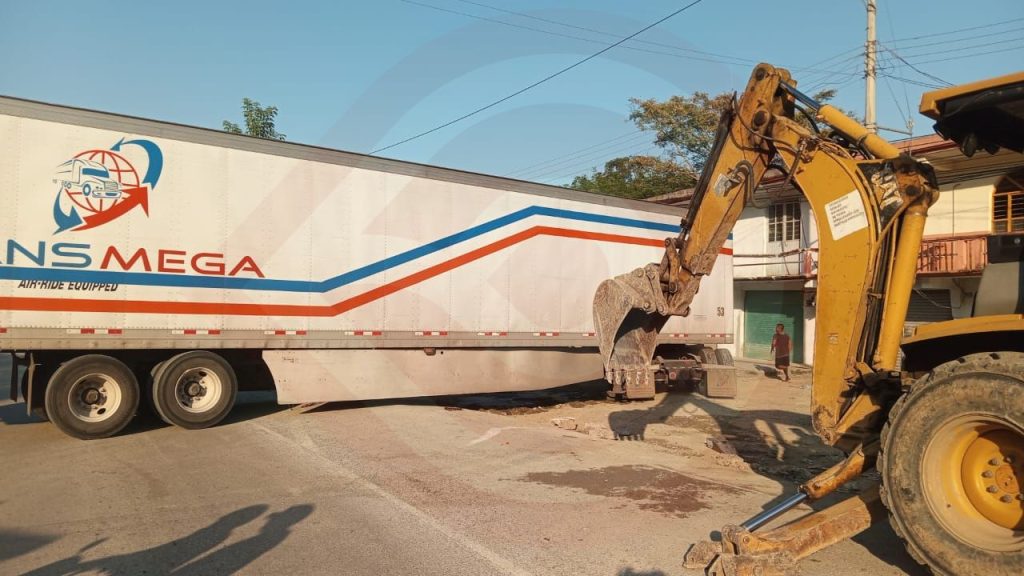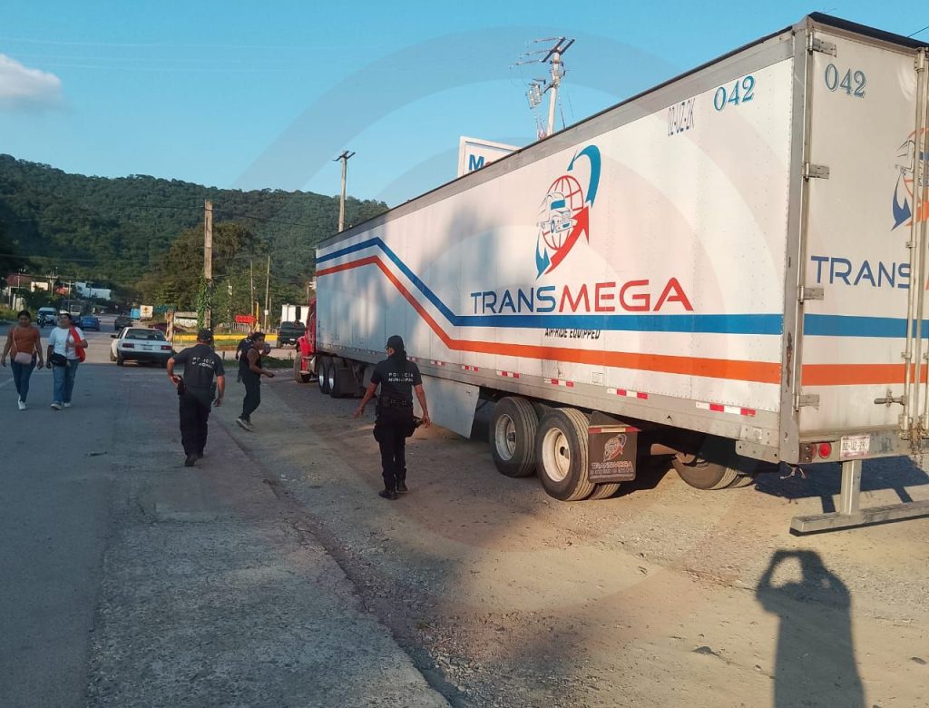 Se trata de un tráiler Freightliner de color rojo con caja seca de color blanco, cuyo conductor intentó realizar maniobras para retornar a la altura de la Guardia Civil Estatal (GCE) y quedó varado en un desnivel bloqueando en su totalidad la rúa federal por varios minutos.