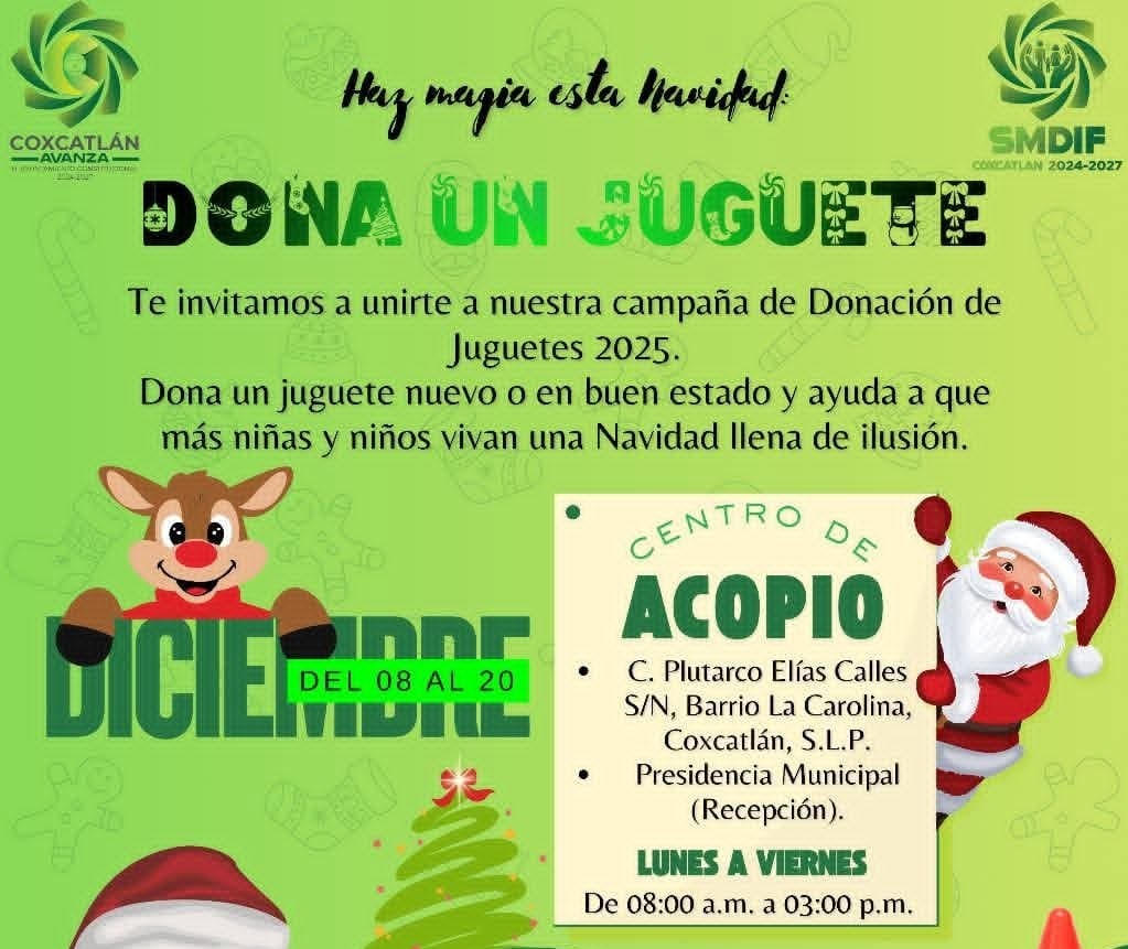 La campaña busca reunir juguetes nuevos o en buen estado que serán entregados a niñas y niños de las diversas comunidades del municipio, con el objetivo de llevarles un mensaje de alegría, esperanza y unión durante la temporada navideña.